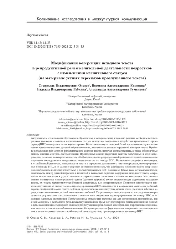 Актуальность исследования обусловлена обращением к эмпирическому изучению речевых особенностей подростков, имеющих изменения в когнитивном статусе вследствие сочетанного воздействия врожденного порока сердца (ВПС) и операции по его корректировке. Теоретико-методологической базой исследования служат положения психолингвистики, детской нейропсихологии, лингвистики речевых нарушений и теории текста. В работе использован ряд методов филологического анализа текста, включая количественные, а также общенаучные методы анализа, синтеза, систематизации. Проведенный анализ вторичных текстов, полученных в ходе эксперимента, позволил подтвердить гипотезу об обусловленности репродуктивной речемыслительной деятельности пациентов последствиями оперативного вмешательства по поводу ВПС. Выявленная специфика когеренции, т. е. глобальной связности, или цельности текста, в пересказах услышанного текста подростков, прооперированных по поводу ВПС, и их условно здоровых сверстников показала, что сокращение исходного текста в пересказе чаще наблюдается в группе испытуемых с прооперированным ВПС в анамнезе. Кроме того, установлена прямая зависимость между длиной пересказа и полнотой и точностью передачи содержания исходного текста: сокращение текста приводит к утрате значимых содержательных элементов и снижению когеренции. Как показал анализ, испытуемые из контрольной группы (условно здоровые) точнее воспроизводят содержание исходного текста, их тексты характеризуются большей цельностью, т. е. когерентностью. Снижение когерентности текстов, полученных от испытуемых с прооперированным ВПС, проявляется в сокращении количества действий героев; ошибочной замене одного действия другим; искажении или утрате мотива и/или следствия действия героев, сюжетно значимых деталей описываемых событий. Теоретико-практическая ценность исследования определяется результатами сопоставительного анализа речи подростков, прооперированных по поводу ВПС, и их условно здоровых сверстников. Представленные результаты значимы как для когнитивной лингвистики, так и для медицины и психологии речи, поскольку в настоящее время нет достоверных лингвокогнитивных данных о том, какой именно спецификой обладает репродуктивная речь данной категории лиц. Перспектива исследования видится в поиске способов количественной параметризации и формализации когеренции текстов-пересказов, в анализе грамматических особенностей речи подростков, прооперированных по поводу ВПС.