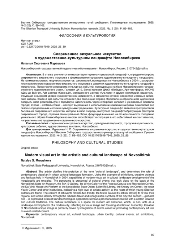 В статье уточняется интерпретация термина «культурный ландшафт», определяется роль современного визуального искусства в формировании городского художественно-культурного ландшафта. На примере выставок, творческих проектов, фестивалей, проходивших в Новосибирске в 2024 г., раскрываются возможности современного визуального искусства в развитии художественно-культурного ландшафта мегаполиса. Представлена панорама культурных событий, проходивших на базе Новосибирского государственного художественного музея, Галереи ЦК19, Белой галереи ЦКиО «Победа», Арт-платформы НГОНБ «Дом да Винчи», Арт-центра «Красный», молодежного центра «Альтаир» и других институций, свидетельствующая о высоком уровне художественной активности, в эпицентре которой находятся молодые сибирские авторы. Контент арт-событий отражает две тенденции: первая обусловлена стремлением художников раскрыть свою региональную и городскую идентичность через сибирский колорит и узнаваемые символы города; вторая - глобалистская - находит выражение в использовании новейших мировых технологий вне связи с определенным местом и культурными традициями. Культурный ландшафт является пространством бытования современного искусства, которое, в свою очередь, выступает ландшафтообразующим фактором современного города, отражая его визуальный образ, фокусируя внимание на его идентичности. Созданию уникального образа Новосибирска во многом способствует интеграция в его событийный контент ивентов, направленных на продвижение современного искусства.