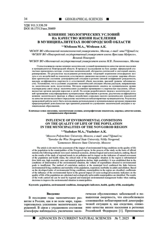 Статья: ВЛИЯНИЕ ЭКОЛОГИЧЕСКИХ УСЛОВИЙ НА КАЧЕСТВО ЖИЗНИ НАСЕЛЕНИЯ В МУНИЦИПАЛИТЕТАХ НОВГОРОДСКОЙ ОБЛАСТИ