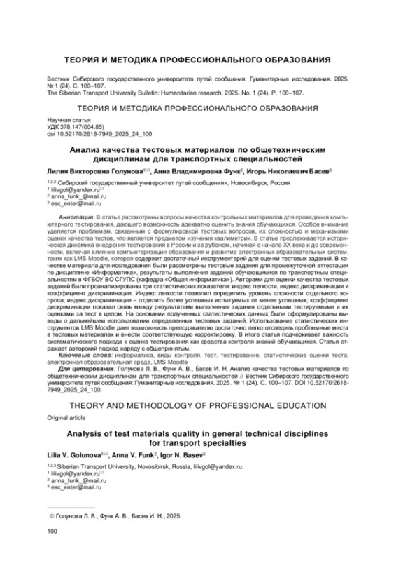 Статья: АНАЛИЗ КАЧЕСТВА ТЕСТОВЫХ МАТЕРИАЛОВ ПО ОБЩЕТЕХНИЧЕСКИМ ДИСЦИПЛИНАМ ДЛЯ ТРАНСПОРТНЫХ СПЕЦИАЛЬНОСТЕЙ