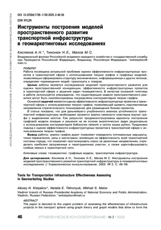 Статья: ИНСТРУМЕНТЫ ПОСТРОЕНИЯ МОДЕЛЕЙ ПРОСТРАНСТВЕННОГО РАЗВИТИЯ ТРАНСПОРТНОЙ ИНФРАСТРУКТУРЫ В ГЕОМАРКЕТИНГОВЫХ ИССЛЕДОВАНИЯХ