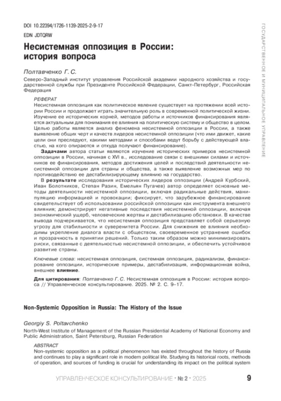 Несистемная оппозиция как политическое явление существует на протяжении всей истории России и продолжает играть значительную роль в современной политической жизни. Изучение ее исторических корней, методов работы и источников финансирования является актуальным для понимания ее влияния на политическую систему и общество в целом. Целью работы является анализ феномена несистемной оппозиции в России, а также выявление общих черт и качеств лидеров несистемной оппозиции (что ими движет, какие цели они преследуют, какими методами и способами ведут борьбу с действующей властью, на кого опираются и откуда получают финансирование). Задачами автора статьи являются изучение исторических примеров несистемной оппозиции в России, начиная с XVI в., исследование связи с внешними силами и источников ее финансирования, методов достижения целей и последствий деятельности несистемной оппозиции для страны и общества, а также выявление возможных мер по противодействию ее дестабилизирующему влиянию на государство. В результате исследования исторических лидеров оппозиции (Андрей Курбский, Иван Болотников, Степан Разин, Емельян Пугачев) автор определяет основные методы деятельности несистемной оппозиции, включая радикальные действия, манипуляцию информацией и провокации; фиксирует, что зарубежное финансирование свидетельствует об использовании российской оппозиции как инструмента внешнего влияния; демонстрирует негативные последствия несистемной оппозиции, включая экономический ущерб, человеческие жертвы и дестабилизацию обстановки. В качестве вывода подчеркивается, что несистемная оппозиция представляет собой серьезную угрозу для стабильности и суверенитета России. Для снижения ее влияния необходимы укрепление диалога власти с обществом, своевременное устранение ошибок и прозрачность в принятии решений. Только таким образом можно минимизировать риски, связанные с деятельностью несистемной оппозиции, и обеспечить устойчивое развитие страны.