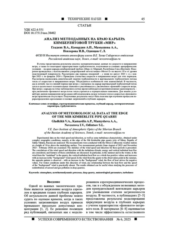 В статье представлены результаты анализа экспериментальных данных по скорости и направлению ветра, а также по некоторым характеристикам турбулентности, полученным в сложных орографических условиях - на краю карьера кимберлитовой трубки «Мир» (г. Мирный, Республика Саха (Якутия)). Измерения проводились с использованием ультразвуковой метеостанции «Метео-2» на высоте 10 м от уровня подстилающей поверхности. Рассмотрено два периода измерений - с июня по август 2023 г. и с ноября 2023 г. по февраль 2024 г. Приведена статистика скорости и направления ветра для этих периодов. Рассмотрена взаимосвязь кинетической энергии турбулентности и вертикального турбулентного потока тепла со скоростью и направлением ветра. Обсуждаются особенности этих взаимосвязей. В частности, как в летний, так и в зимний период при ветре с «материка» на карьер вертикальный турбулентный поток тепла в целом имеет положительные значения и увеличивается с увеличением «фоновой» скорости ветра. При ветре с карьера на точку наблюдения в летнее время наблюдается противоположная закономерность - при увеличении «фонового» ветра поток тепла стремится к отрицательным значениям. Для зимних условий при данном направлении ветра какая-либо взаимосвязь между потоком тепла и скоростью «фонового» ветра практически отсутствует. Полученные результаты могут быть полезны при изучении процессов перераспределения аэрозольных и газовых загрязнений в глубоких карьерах.