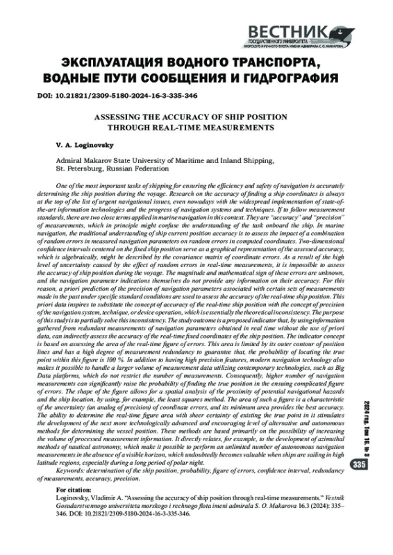 Темой исследования является одна из наиболее важных задач морской навигации в обеспечении безопасности и эффективности мореплавания, а именно точность определения координат места судна. Несмотря на интенсивное внедрение информационных технологий и повышение точности навигационных систем и методов в списке актуальных задач мореплавания постоянно находятся исследования, связанные с точностью определения координат места судна. Традиционно под оценкой точности текущих координат места судна в морской навигации понимается априорная оценка влияния комбинации случайных погрешностей измеренных навигационных параметров на случайные погрешности рассчитанных координат. С помощью этой информации осуществляется подмена точности текущих координат места судна понятием «точность работы навигационной системы или метода», что принципиально является теоретическим несоответствием. Целью данного исследования является попытка частично компенсировать это несоответствие. Для этого предложен индикатор, позволяющий косвенно оценить текущую точность обсервованных координат места судна по информации, содержащейся в избыточных измерениях, полученных в масштабе реального времени без использования априорных данных. Идея индикатора основана на оценке площади фигуры погрешностей линий положения, ограниченной ее внешним контуром при высоком уровне избыточности измерений, обеспечивающих вероятность нахождения истинной точки в этой фигуре, равной 100 %. Отмечается, что современная навигационная техника характеризуется не только высокими точностными характеристиками, но и позволяет наращивать объем измерительной информации, используя для ее обработки современные технологии, включая платформы Big Data. Возможность определения текущей области с полной достоверностью нахождения в ней истинной точки стимулирует развитие следующего более технологичного и перспективного уровня автономных методов определения места судна, который напрямую относится, например, к развитию азимутальных методов мореходной астрономии, позволяющих выполнять неограниченное количество измерений в отсутствии видимого горизонта, что, несомненно, является актуальным при плавании судов в условиях высоких широт, особенно в длительный период полярной ночи.