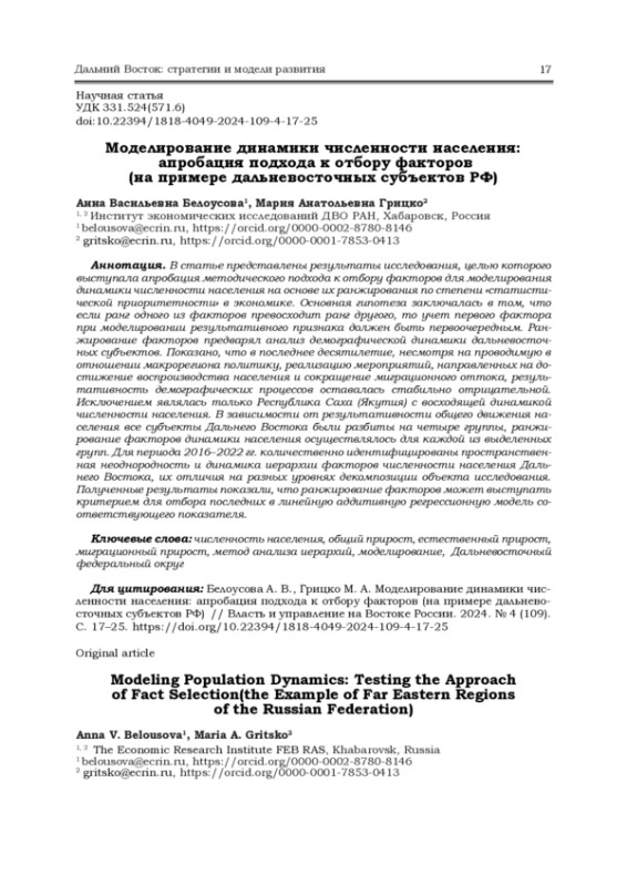 В статье представлены результаты исследования, целью которого выступала апробация методического подхода к отбору факторов для моделирования динамики численности населения на основе их ранжирования по степени «статистической приоритетности» в экономике. Основная гипотеза заключалась в том, что если ранг одного из факторов превосходит ранг другого, то учет первого фактора при моделировании результативного признака должен быть первоочередным. Ранжирование факторов предварял анализ демографической динамики дальневосточных субъектов. Показано, что в последнее десятилетие, несмотря на проводимую в отношении макрорегиона политику, реализацию мероприятий, направленных на достижение воспроизводства населения и сокращение миграционного оттока, результативность демографических процессов оставалась стабильно отрицательной. Исключением являлась только Республика Саха (Якутия) с восходящей динамикой численности населения. В зависимости от результативности общего движения населения все субъекты Дальнего Востока были разбиты на четыре группы, ранжирование факторов динамики населения осуществлялось для каждой из выделенных групп. Для периода 2016-2022 гг. количественно идентифицированы пространственная неоднородность и динамика иерархии факторов численности населения Дальнего Востока, их отличия на разных уровнях декомпозиции объекта исследования. Полученные результаты показали, что ранжирование факторов может выступать критерием для отбора последних в линейную аддитивную регрессионную модель соответствующего показателя.