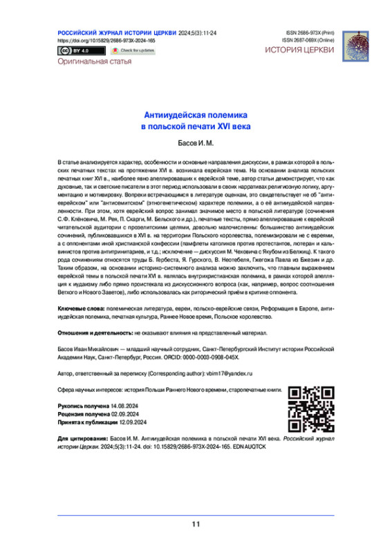 Статья: Антииудейская полемика в польской печати XVI века