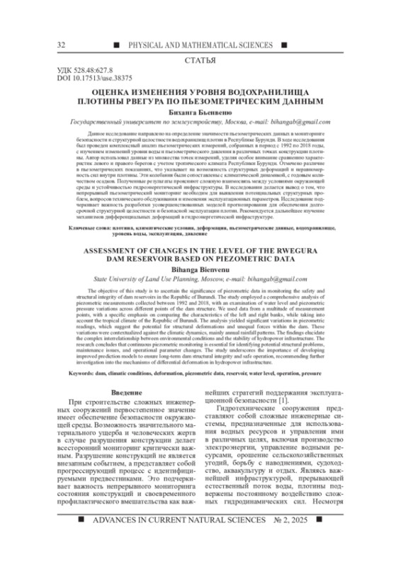 Данное исследование направлено на определение значимости пьезометрических данных в мониторинге безопасности и структурной целостности водохранилищ плотин в Республике Бурунди. В ходе исследования был проведен комплексный анализ пьезометрических измерений, собранных в период с 1992 по 2018 годы, с изучением изменений уровня воды и пьезометрического давления в различных точках конструкции плотины. Автор использовал данные из множества точек измерений, уделяя особое внимание сравнению характеристик левого и правого берегов с учетом тропического климата Республики Бурунди. Отмечено различие в пьезометрических показаниях, что указывает на возможность структурных деформаций и неравномерность сил внутри плотины. Эти колебания были сопоставлены с климатической динамикой, с годовым количеством осадков. Полученные результаты проясняют сложную взаимосвязь между условиями окружающей среды и устойчивостью гидроэнергетической инфраструктуры. В исследовании делается вывод о том, что непрерывный пьезометрический мониторинг необходим для выявления потенциальных структурных проблем, вопросов технического обслуживания и изменения эксплуатационных параметров. Исследование подчеркивает важность разработки усовершенствованных моделей прогнозирования для обеспечения долгосрочной структурной целостности и безопасной эксплуатации плотин. Рекомендуется дальнейшее изучение механизмов дифференциальных деформаций в гидроэнергетической инфраструктуре.