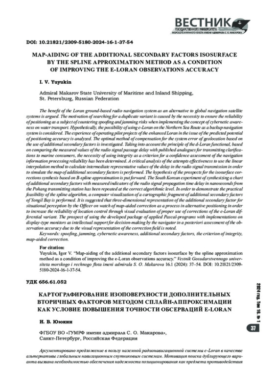 Статья: КАРТОГРАФИРОВАНИЕ ИЗОПОВЕРХНОСТИ ДОПОЛНИТЕЛЬНЫХ ВТОРИЧНЫХ ФАКТОРОВ МЕТОДОМ СПЛАЙН-АППРОКСИМАЦИИ КАК УСЛОВИЕ ПОВЫШЕНИЯ ТОЧНОСТИ ОБСЕРВАЦИЙ E-LORAN