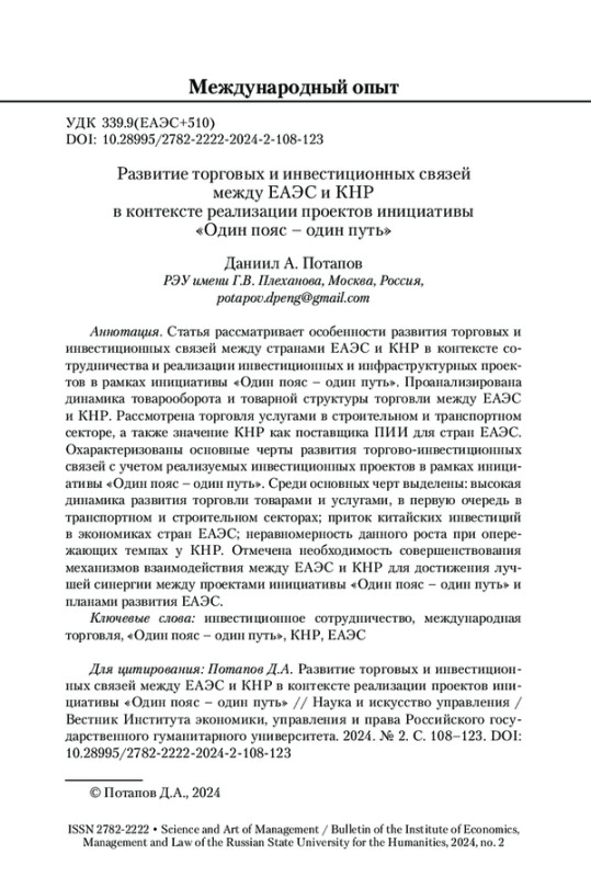 Статья: Развитие торговых и инвестиционных связей между ЕАЭС и КНР в контексте реализации проектов инициативы «Один пояс – один путь»