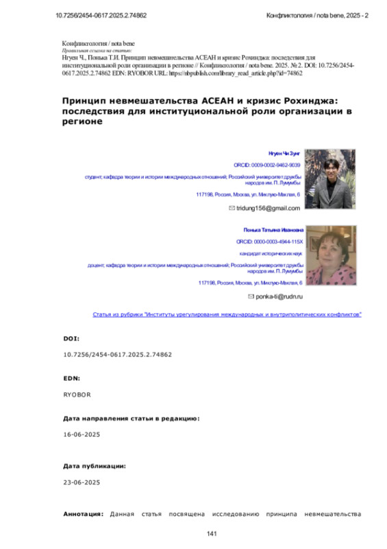 Статья: Принцип невмешательства АСЕАН и кризис Рохинджа: последствия для институциональной роли организации в регионе