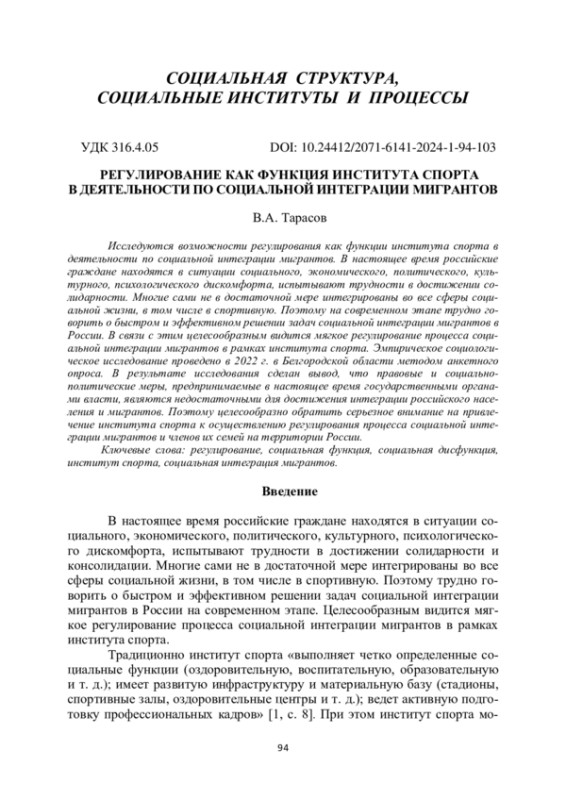 Статья: РЕГУЛИРОВАНИЕ КАК ФУНКЦИЯ ИНСТИТУТА СПОРТА В ДЕЯТЕЛЬНОСТИ ПО СОЦИАЛЬНОЙ ИНТЕГРАЦИИ МИГРАНТОВ