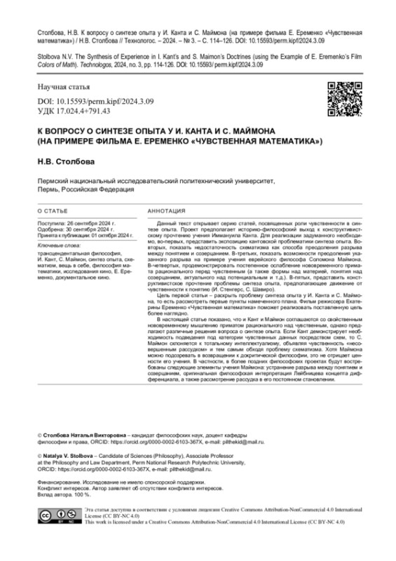 Статья: К ВОПРОСУ О СИНТЕЗЕ ОПЫТА У И. КАНТА И С. МАЙМОНА (НА ПРИМЕРЕ ФИЛЬМА Е. ЕРЕМЕНКО "ЧУВСТВЕННАЯ МАТЕМАТИКА")