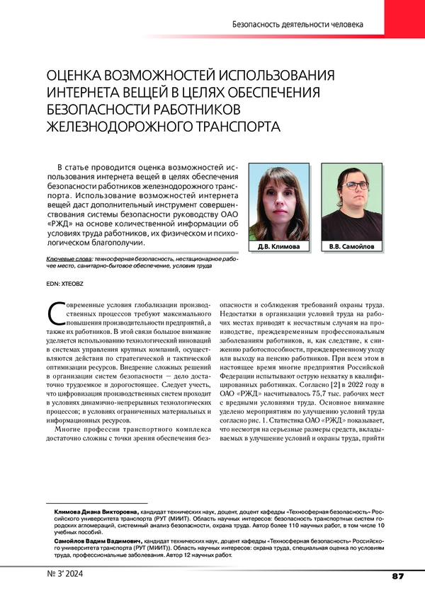 Статья: ОЦЕНКА ВОЗМОЖНОСТЕЙ ИСПОЛЬЗОВАНИЯ ИНТЕРНЕТА ВЕЩЕЙ В ЦЕЛЯХ ОБЕСПЕЧЕНИЯ БЕЗОПАСНОСТИ РАБОТНИКОВ ЖЕЛЕЗНОДОРОЖНОГО ТРАНСПОРТА