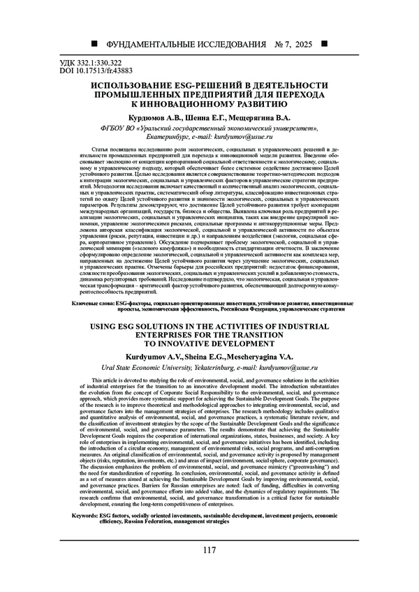 Статья посвящена исследованию роли экологических, социальных и управленческих решений в деятельности промышленных предприятий для перехода к инновационной модели развития. Введение обосновывает эволюцию от концепции корпоративной социальной ответственности к экологическому, социальному и управленческому подходу, который обеспечивает более системное содействие достижению Целей устойчивого развития. Целью исследования является совершенствование теоретико-методических подходов к интеграции экологических, социальных и управленческих факторов в управленческие стратегии предприятий. Методология исследования включает качественный и количественный анализ экологических, социальных и управленческих практик, систематический обзор литературы, классификацию инвестиционных стратегий по охвату Целей устойчивого развития и значимости экологических, социальных и управленческих параметров. Результаты демонстрируют, что достижение Целей устойчивого развития требует кооперации международных организаций, государств, бизнеса и общества. Выявлена ключевая роль предприятий в реализации экологических, социальных и управленческих инициатив, таких как внедрение циркулярной экономики, управление экологическими рисками, социальные программы и антикоррупционные меры. Предложена авторская классификация экологической, социальной и управленческой активности по объектам управления (риски, репутация, инвестиции и др.) и направлениям воздействия (экология, социальная сфера, корпоративное управление). Обсуждение подчеркивает проблему экологической, социальной и управленческой мимикрии («зеленого камуфляжа») и необходимость стандартизации отчетности. В заключение сформулировано определение экологической, социальной и управленческой активности как комплекса мер, направленных на достижение Целей устойчивого развития через улучшение экологических, социальных и управленческих практик. Отмечены барьеры для российских предприятий: недостаток финансирования, сложности преобразования экологических, социальных и управленческих усилий в добавленную стоимость, динамика регуляторных требований. Исследование подтвердило, что экологическая, социальная и управленческая трансформация - критический фактор устойчивого развития, обеспечивающий долгосрочную конкурентоспособность предприятий.