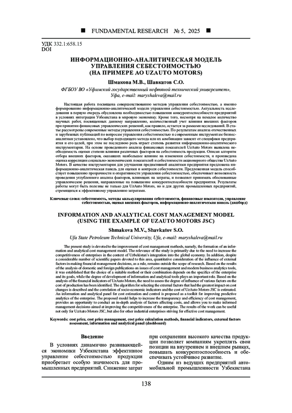 Настоящая работа посвящена совершенствованию методов управления себестоимостью, а именно формированию информационно-аналитической модели управления себестоимостью. Актуальность исследования в первую очередь обусловлена необходимостью повышения конкурентоспособности предприятий в условиях интеграции Узбекистана в мировую экономику. Кроме того, несмотря на немалое количество научных работ, посвященных данному направлению, количественный учет влияния внешних факторов при принятии финансовых управленческих решений, как правило, остается за рамками исследований. В статье рассмотрены современные методы управления себестоимостью. По результатам анализа отечественных и зарубежных публикаций по вопросам управления себестоимостью и современным инструментам бизнес-аналитики установлено, что выбор подходящего метода или их комбинации зависит от специфики предприятия и его целей, при этом не последнюю роль играет степень развития информационно-аналитического инструментария. На основе проведенного анализа финансовых показателей UzAuto Motors выявлена необходимость оценки степени влияния различных факторов на себестоимость продукции. Описан алгоритм отбора внешних факторов, оказавших наибольшее влияние на изменения себестоимости, и произведена оценка корреляции социально-экономических показателей и себестоимости акционерного общества UzAuto Motors. В качестве инструментария для улучшения предиктивной аналитики предприятия предложена информационно-аналитическая панель для оценки и контроля себестоимости. Предложенная модель способствует повышению прозрачности и оперативности управления себестоимостью, обеспечивает возможность проведения углубленного анализа факторов, влияющих на затраты, и позволяет принимать обоснованные управленческие решения, направленные на повышение конкурентоспособности предприятия. Результаты работы могут быть полезны не только для UzAuto Motors, но и для других промышленных предприятий, стремящихся к эффективному управлению затратами.