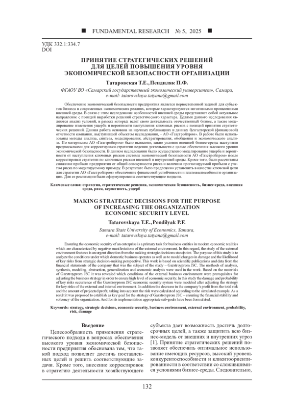 Статья: ПРИНЯТИЕ СТРАТЕГИЧЕСКИХ РЕШЕНИЙ ДЛЯ ЦЕЛЕЙ ПОВЫШЕНИЯ УРОВНЯ ЭКОНОМИЧЕСКОЙ БЕЗОПАСНОСТИ ОРГАНИЗАЦИИ
