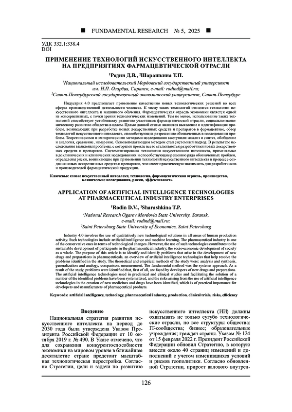 Индустрия 4.0 предполагает применение качественно новых технологических решений во всех сферах производственной деятельности человека. К числу таких технологий относятся технологии искусственного интеллекта и машинного обучения. Фармацевтическая отрасль экономики является одной из консервативных, с точки зрения технологических изменений. Тем не менее, использование таких технологий способствует устойчивому развитию участников фармацевтической отрасли, социально-экономическому развитию общества в целом. Целью данной статьи являются выявление и идентификация проблем, возникающих при разработке новых лекарственных средств и препаратов в фармацевтике, обзор технологий искусственного интеллекта, способствующих разрешению обозначенных в исследовании проблем. Теоретическими и эмпирическими методами исследования выступили: анализ и синтез, обобщение и аналогия, сравнение, измерение. Основополагающим методом стал системный подход. В результате исследования выявлены проблемы, с которыми прежде всего сталкиваются разработчики новых лекарственных средств и препаратов. Систематизированы технологии искусственного интеллекта, применяемые в доклинических и клинических исследованиях и способствующие решению ряда обозначенных проблем, определены риски, возникающие при применении технологий искусственного интеллекта в процессе создания новых лекарственных средств и препаратов, что имеет практическую значимость для разработчиков и производителей фармацевтической продукции.