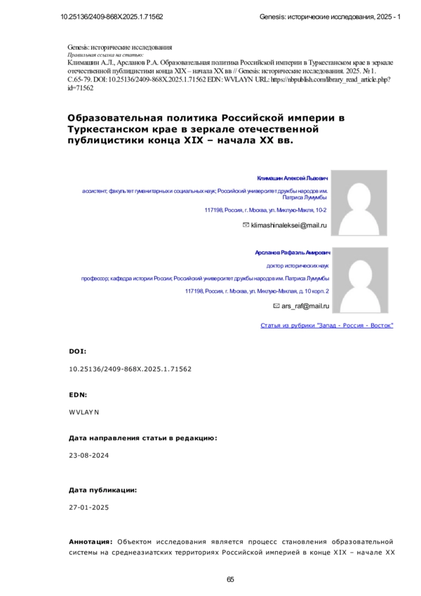 Статья: Образовательная политика Российской империи в Туркестанском крае в зеркале отечественной публицистики конца ХIХ – начала ХХ вв.