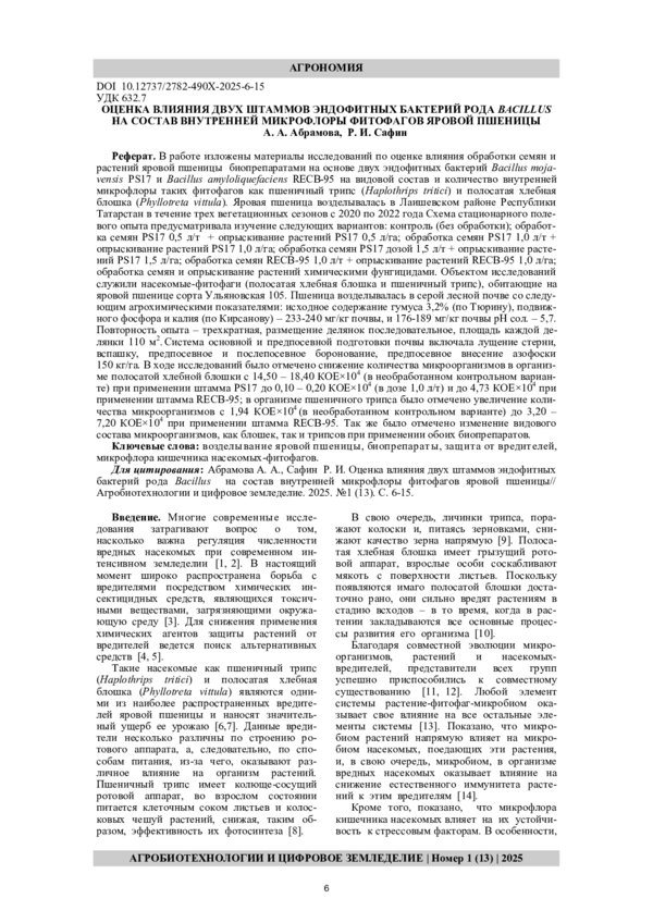 В работе изложены материалы исследований по оценке влияния обработки семян и растений яровой пшеницы биопрепаратами на основе двух эндофитных бактерий Bacillus mojavensis PS17 и Bacillus amyloliquefaciens RECB-95 на видовой состав и количество внутренней микрофлоры таких фитофагов как пшеничный трипс (Haplothrips tritici) и полосатая хлебная блошка (Phyllotreta vittula). Яровая пшеница возделывалась в Лаишевском районе Республики Татарстан в течение трех вегетационных сезонов с 2020 по 2022 года Схема стационарного полевого опыта предусматривала изучение следующих вариантов: контроль (без обработки); обработка семян PS17 0,5 л/т + опрыскивание растений PS17 0,5 л/га; обработка семян PS17 1,0 л/т + опрыскивание растений PS17 1,0 л/га; обработка семян PS17 дозой 1,5 л/т + опрыскивание растений PS17 1,5 л/га; обработка семян RECB-95 1,0 л/т + опрыскивание растений RECB-95 1,0 л/га; обработка семян и опрыскивание растений химическими фунгицидами. Объектом исследований служили насекомые-фитофаги (полосатая хлебная блошка и пшеничный трипс), обитающие на яровой пшенице сорта Ульяновская 105. Пшеница возделывалась в серой лесной почве со следующим агрохимическими показателями: исходное содержание гумуса 3,2% (по Тюрину), подвижного фосфора и калия (по Кирсанову) – 233-240 мг/кг почвы, и 176-189 мг/кг почвы рН сол. – 5,7. Повторность опыта – трехкратная, размещение делянок последовательное, площадь каждой делянки 110 м2. Система основной и предпосевной подготовки почвы включала лущение стерни, вспашку, предпосевное и послепосевное боронование, предпосевное внесение азофоски 150 кг/га. В ходе исследований было отмечено снижение количества микроорганизмов в организме полосатой хлебной блошки с 14,50 – 18,40 КОЕ×104 (в необработанном контрольном варианте) при применении штамма PS17 до 0,10 – 0,20 КОЕ×104 (в дозе 1,0 л/т) и до 4,73 КОЕ×104 при применении штамма RECB-95; в организме пшеничного трипса было отмечено увеличение количества микроорганизмов с 1,94 КОЕ×104 (в необработанном контрольном варианте) до 3,20 – 7,20 КОЕ×104 при применении штамма RECB-95. Так же было отмечено изменение видового состава микроорганизмов, как блошек, так и трипсов при применении обоих биопрепаратов.