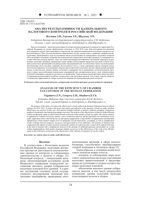 Цель исследования - анализ результативности осуществления камерального контроля на территории Российской Федерации на основе официальной статистики за 2019-2023 годы. Для достижения поставленной цели проведена оценка таких критериев и показателей, как динамика камерального налогового контроля и его результативность. При этом использовались общенаучные методы: анализ, синтез, сравнение, графическая визуализация. Проведенный в ходе исследования анализ результативности камерального налогового контроля в России выявил тенденцию снижения числа проводимых камеральных налоговых проверок. Сложившаяся ситуация объясняется рядом причин, таких как: новая коронавирусная инфекция и наложение моратория на проведение налоговых проверок; применение новых правил использования контрольно-кассовой техники большим количеством организаций и индивидуальных предпринимателей, что обеспечило более высокий уровень автоматизации учета кассовых операций, бухгалтерского учета, а также упрощение обмена данными между налогоплательщиками, плательщиками сборов и представителями налоговых органов. Проведенный авторами анализ статистических данных выявил тенденцию сокращения числа проводимых уполномоченными органами в сфере налогообложения контрольных мероприятий при одновременном росте сумм доначисленных платежей и штрафных санкции по результату их проведения. Такая положительная динамика свидетельствует о повышении результативности работы должностных лиц налоговых органов, что, в свою очередь, приведет к повышению эффективности отбора налогоплательщиков для проведения выездного контроля.