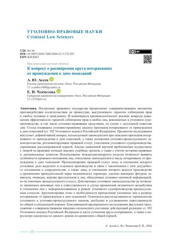 Анализ заявленной научной проблематики осуществлен с опорой на правовые позиции высших судебных органов, а также с учетом историко- правовых и доктринальных аспектов. Использование междисциплинарного подхода позволило выявить особенности правового положения лиц, отнесенных законодателем к числу потерпевших от принуждения к даче показаний. Проанализирован правовой статус лица, в отношении которого уголовное дело выделено в отдельное производство в связи с заключением с ним досудебного соглашения о сотрудничестве, а также лица, в отношении которого ведется производство о применении принудительной меры медицинского характера, уделено внимание фигурам заявителя, очевидца, жертвы преступления и лиц, обладающих уголовно-значимой информацией, но не имеющих процессуального статуса. Действующее уголовное законодательство не позволяет привлекать виновных лиц к ответственности в случае применения незаконного воздействия в отношении лиц с неформализованным в рамках уголовного судопроизводства процессуальным статусом. Аргументирован тезис о необходимости причисления указанных лиц к разряду потерпевших от принуждения к даче показаний. Отмечается рассогласованность терминологии уголовного и уголовно-процессуального законов, дисбаланс в установлении ответственности по общей и специальной нормам. Консеквенцией предпринятого исследования выступают предложения о совершенствовании юридико-технического состояния действующей редакции ст. 302 Уголовного кодекса Российской Федерации в части уточнения круга потерпевших, а также о пересмотре наказуемости данного деяния по сравнению с общей нормой.