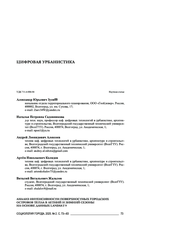 Статья: АНАЛИЗ ИНТЕНСИВНОСТИ ПОВЕРХНОСТНЫХ ГОРОДСКИХ ОСТРОВОВ ТЕПЛА В ЛЕТНИЙ И ЗИМНИЙ СЕЗОНЫ НА ОСНОВЕ ДАННЫХ LANDSAT 9