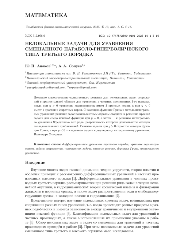 Статья: НЕЛОКАЛЬНЫЕ ЗАДАЧИ ДЛЯ УРАВНЕНИЯ СМЕШАННОГО ПАРАБОЛО-ГИПЕРБОЛИЧЕСКОГО ТИПА ТРЕТЬЕГО ПОРЯДКА
