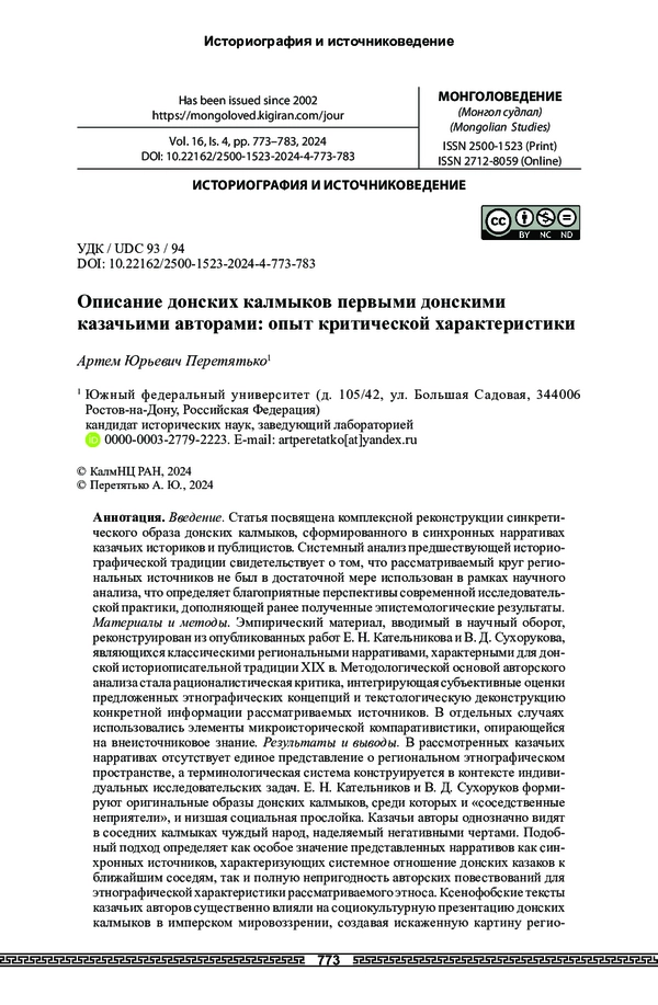 Статья: Описание донских калмыков первыми донскими казачьими авторами: опыт критической характеристики