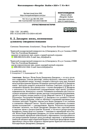Введение. Жизнь Бидии Дандаровича Дандарона ― это путь духовного подвижника, Учителя, философа, ученого-буддолога, тибетолога, йогина и мастера буддийской тантры, человека, который в советскую эпоху внес большой вклад в распространение буддизма. На примере трагичной судьбы Б. Д. Дандарона можно проследить развитие религиозной политики Советского государства по отношению к буддизму. Цель данной статьи ― изучить биографию Б. Д. Дандарона и деятельность его последователей («дандароновцев») через призму духовного подвижничества. Материалы и методы. Основными источниками для статьи послужили материалы семейного архива, рассказы и воспоминания родственников, друзей и учеников, которые вошли в состав «Мирской Сангхи» Б. Д. Дандарона. Результаты. Рассмотрены биографии Б. Д. Дандарона и его духовного Учителя Лубсана Самдана Цыденова, этапы их обучения и становления крупными религиозными деятелями. Подробно описана роль Бидии Дандарона и его учеников в становлении «Мирской Сангхи». Уделено внимание современному состоянию группы последователей ― «дандароновцев». Выводы. Результаты исследования позволяют заключить, что Бидия Дандарович Дандарон внес серьезный вклад в советское время в распространение буддизма, в частности распространение буддийского учения среди его учеников ― выходцев из европейской части России. Жизнь Бидии Дандаровича Дандарона, его тесное взаимодействие с русской интеллигенцией, европейской цивилизацией и образованием стали фундаментом для распространения буддизма среди российских верующих и проникновения ценностей западного мира в бурятский буддизм. Религиозно-философская основа евразийского синтеза была заложена в мировоззрение бурятской интеллигенции благодаря Бидии Дандаровичу Дандарону.