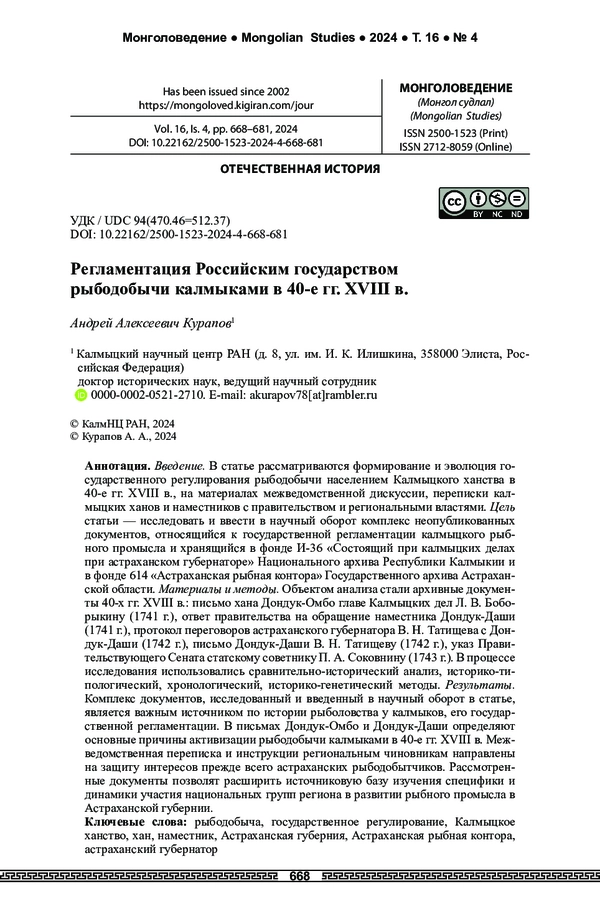 Статья: Регламентация Российским государством рыбодобычи калмыками в 40-е гг. XVIII в.