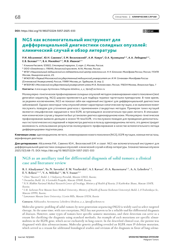 Молекулярно-генетическое профилирование солидных опухолей методом секвенирования нового поколения (next generation sequencing, NGS) широко применяется для подбора терапии таргетными препаратами. В тоже время, за редкими исключениями, NGS не показал себя как надежный инструмент для дифференциальной диагностики заболеваний. Однако некоторые типы опухолей имеют характерные соматические мутации, и их выявление может послужить поводом для уточнения диагноза с применением стандартных методов. Примером таких мутаций являются специфические нарушения в гене EGFR, встречающиеся исключительно при раке легкого. В описывае‑ мом клиническом случае у пациентки был установлен диагноз аденокарцинома кожи. Молекулярно-генетическое профилирование выявило делецию в экзоне 19 гена EGFR, что послужило поводом для проведения дополнитель‑ ных гистологических исследований и пересмотра диагноза в пользу аденокарциномы легкого; это демонстрирует возможность использования результатов молекулярного профилирования в качестве вспомогательного метода дифференцировки подтипов рака.