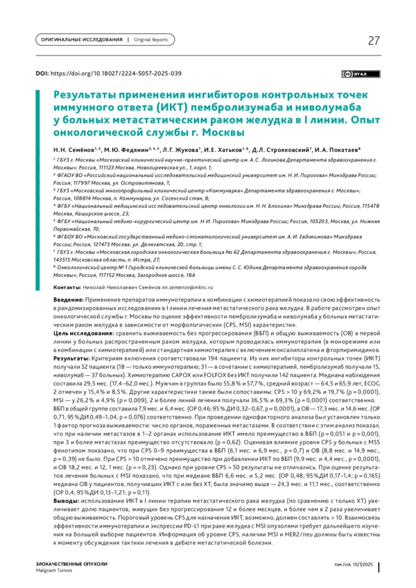 Статья: Результаты применения ингибиторов контрольных точек иммунного ответа (ИКТ) пембролизумаба и ниволумаба у больных метастатическим раком желудка в I линии. Опыт онкологической службы г. Москвы