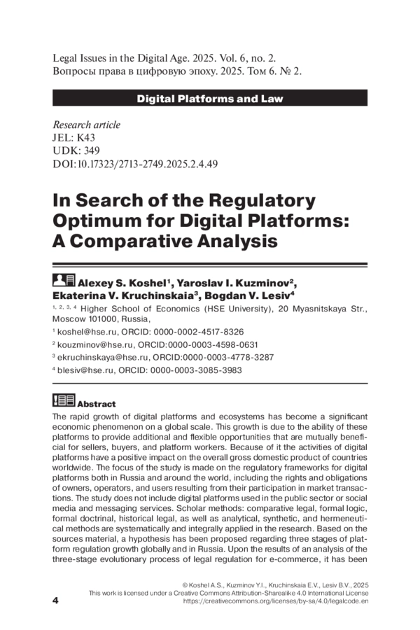 Статья: In Search of the Regulatory Optimum for Digital Platforms: A Comparative Analysis