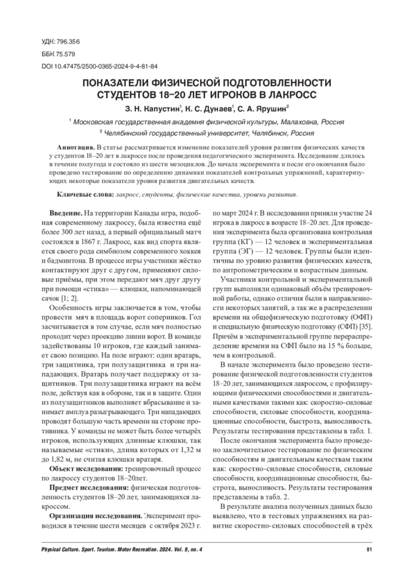 Статья: ПОКАЗАТЕЛИ ФИЗИЧЕСКОЙ ПОДГОТОВЛЕННОСТИ СТУДЕНТОВ 18-20 ЛЕТ ИГРОКОВ В ЛАКРОСС