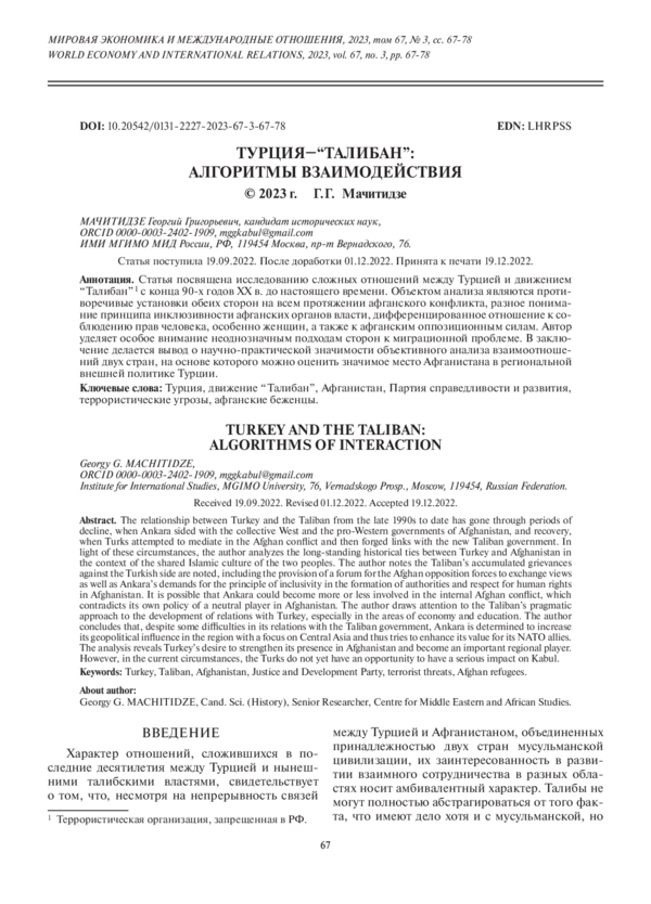 Статья посвящена исследованию сложных отношений между Турцией и движением “Талибан”[1] с конца 90-х годов ХХ в. до настоящего времени. Объектом анализа являются противоречивые установки обеих сторон на всем протяжении афганского конфликта, разное понимание принципа инклюзивности афганских органов власти, дифференцированное отношение к соблюдению прав человека, особенно женщин, а также к афганским оппозиционным силам. Автор уделяет особое внимание неоднозначным подходам сторон к миграционной проблеме. В заключение делается вывод о научно-практической значимости объективного анализа взаимоотношений двух стран, на основе которого можно оценить значимое место Афганистана в региональной внешней политике Турции. [1] Террористическая организация, запрещенная в РФ.