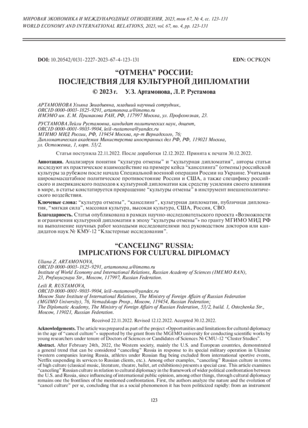 Статья: “ОТМЕНА” РОССИИ: ПОСЛЕДСТВИЯ ДЛЯ КУЛЬТУРНОЙ ДИПЛОМАТИИ
