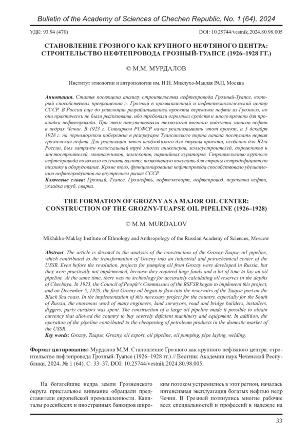 Статья посвящена анализу строительства нефтепровода Грозный-Туапсе, который способствовал превращению г. Грозный в промышленный и нефтетехнологический центр СССР. В России еще до революции разрабатывались проекты перекачки нефти из Грозного, но они практически не были реализованы, ибо требовали огромных средств и много времени для про кладки нефтепровода. При этом отсутствовала технология точного подсчета запасов нефти в недрах Чечни. В 1923 г. Совнарком РСФСР начал реализовывать этот проект, а 5 декабря 1928 г. на черноморском побережье в резервуары Туапсинского порта начала поступать первая грозненская нефть. Для реализации этого необходимого для страны проекта, особенно для Юга России, был затрачен колоссальный труд многих инженеров, землеустроителей, дорожников и мостостроителей, монтажников, землекопов, партийных кураторов. Строительство крупного нефтепровода позволило получать валюту, позволявшую покупать для страны остродефицитную технику и оборудование. Кроме того, функционирование нефтепровода способствовало удешевлению нефтепродуктов на внутреннем рынке СССР.