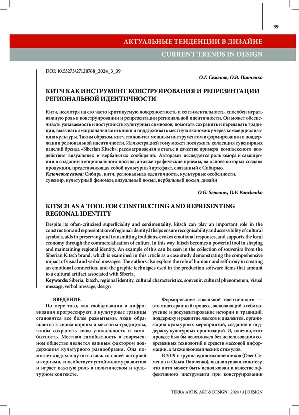 Китч, несмотря на его часто критикуемую поверхностность и сентиментальность, способен играть важную роль в конструировании и репрезентации региональной идентичности. Он может обеспечивать узнаваемость и доступность культурных символов, помогать сохранять и передавать традиции, вызывать эмоциональные отклики и поддерживать местную экономику через коммерциализацию культуры. Таким образом, китч становится мощным инструментом в формировании и поддержании региональной идентичности. Иллюстрацией тому может послужить коллекция сувенирных изделий бренда «Siberian Kitsch», рассматриваемая в статье в качестве примера комплексного воздействия визуальных и вербальных сообщений. Авторами исследуется роль юмора и самоиронии в создании эмоционального посыла, а также графические приемы, на основе которых создана продукция, представляющая собой культурный артефакт, связанный с Сибирью.