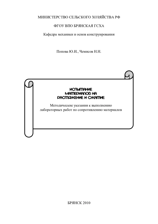 Попова, Ю.И. Испытание материалов на растяжение и сжатие: методические указания к лабораторным работам по сопротивлению материалов для студентов всех специальностей и всех форм обучения / Ю.И. Попова, Н.Н.