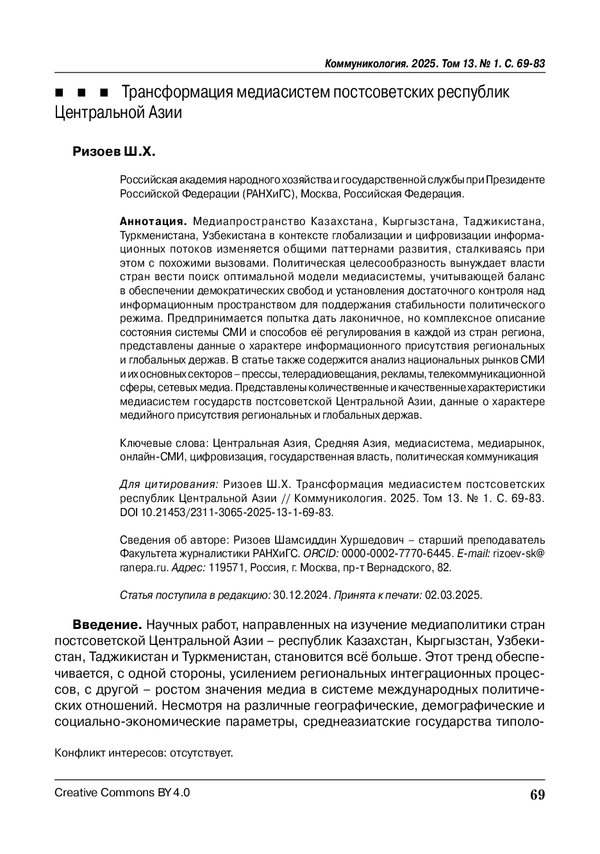 Медиапространство Казахстана, Кыргызстана, Таджикистана, Туркменистана, Узбекистана в контексте глобализации и цифровизации информационных потоков изменяется общими паттернами развития, сталкиваясь при этом с похожими вызовами. Политическая целесообразность вынуждает власти стран вести поиск оптимальной модели медиасистемы, учитывающей баланс в обеспечении демократических свобод и установления достаточного контроля над информационным пространством для поддержания стабильности политического режима. Предпринимается попытка дать лаконичное, но комплексное описание состояния системы СМИ и способов её регулирования в каждой из стран региона, представлены данные о характере информационного присутствия региональных и глобальных держав. В статье также содержится анализ национальных рынков СМИ и их основных секторов – прессы, телерадиовещания, рекламы, телекоммуникационной сферы, сетевых медиа. Представлены количественные и качественные характеристики медиасистем государств постсоветской Центральной Азии, данные о характере медийного присутствия региональных и глобальных держав.