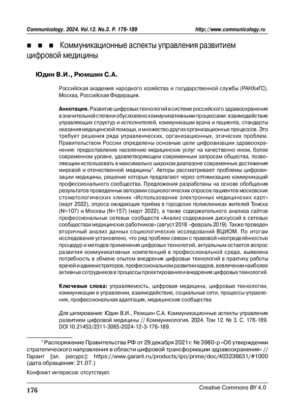 Статья: КОММУНИКАЦИОННЫЕ АСПЕКТЫ УПРАВЛЕНИЯ РАЗВИТИЕМ ЦИФРОВОЙ МЕДИЦИНЫ