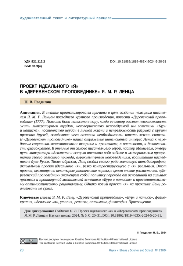 Статья: ПРОЕКТ ИДЕАЛЬНОГО "Я" В "ДЕРЕВЕНСКОМ ПРОПОВЕДНИКЕ" Я. М. Р. ЛЕНЦА