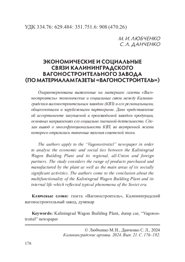 Статья: ЭКОНОМИЧЕСКИЕ И СОЦИАЛЬНЫЕ СВЯЗИ КАЛИНИНГРАДСКОГО ВАГОНОСТРОИТЕЛЬНОГО ЗАВОДА (ПО МАТЕРИАЛАМ ГАЗЕТЫ «ВАГОНОСТРОИТЕЛЬ»)
