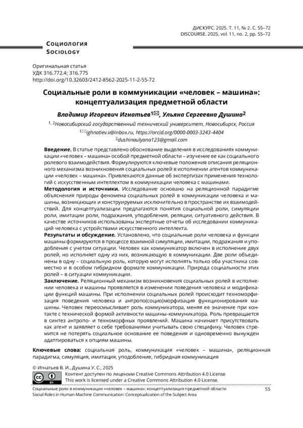 Статья: СОЦИАЛЬНЫЕ РОЛИ В КОММУНИКАЦИИ «ЧЕЛОВЕК - МАШИНА»: КОНЦЕПТУАЛИЗАЦИЯ ПРЕДМЕТНОЙ ОБЛАСТИ