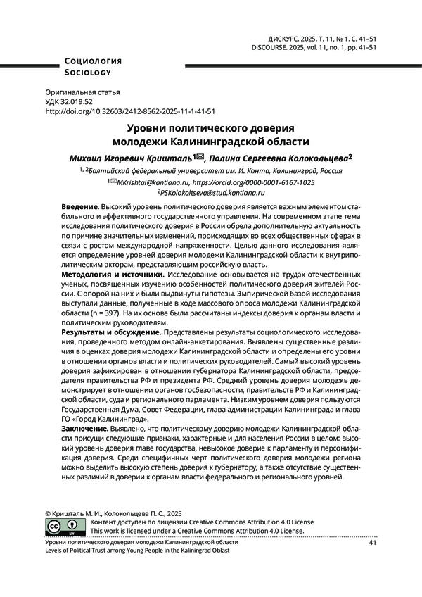 Статья: УРОВНИ ПОЛИТИЧЕСКОГО ДОВЕРИЯ МОЛОДЕЖИ КАЛИНИНГРАДСКОЙ ОБЛАСТИ