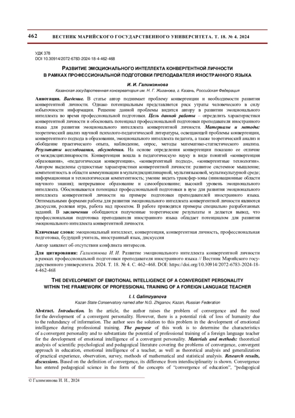Статья: РАЗВИТИЕ ЭМОЦИОНАЛЬНОГО ИНТЕЛЛЕКТА КОНВЕРГЕНТНОЙ ЛИЧНОСТИ В РАМКАХ ПРОФЕССИОНАЛЬНОЙ ПОДГОТОВКИ ПРЕПОДАВАТЕЛЯ ИНОСТРАННОГО ЯЗЫКА