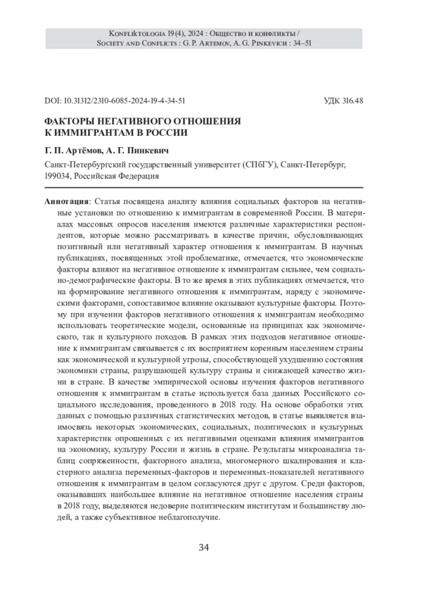 Статья посвящена анализу влияния социальных факторов на негативные установки по отношению к иммигрантам в современной России. В материалах массовых опросов населения имеются различные характеристики респондентов, которые можно рассматривать в качестве причин, обусловливающих позитивный или негативный характер отношения к иммигрантам. В научных публикациях, посвященных этой проблематике, отмечается, что экономические факторы влияют на негативное отношение к иммигрантам сильнее, чем социально-демографические факторы. В то же время в этих публикациях отмечается, что на формирование негативного отношения к иммигрантам, наряду с экономическими факторами, сопоставимое влияние оказывают культурные факторы. Поэтому при изучении факторов негативного отношения к иммигрантам необходимо использовать теоретические модели, основанные на принципах как экономического, так и культурного походов. В рамках этих подходов негативное отношение к иммигрантам связывается с их восприятием коренным населением страны как экономической и культурной угрозы, способствующей ухудшению состояния экономики страны, разрушающей культуру страны и снижающей качество жизни в стране. В качестве эмпирической основы изучения факторов негативного отношения к иммигрантам в статье используется база данных Российского социального исследования, проведенного в 2018 году. На основе обработки этих данных с помощью различных статистических методов, в статье выявляется взаимосвязь некоторых экономических, социальных, политических и культурных характеристик опрошенных с их негативными оценками влияния иммигрантов на экономику, культуру России и жизнь в стране. Результаты микроанализа таблиц сопряженности, факторного анализа, многомерного шкалирования и кластерного анализа переменных-факторов и переменных-показателей негативного отношения к иммигрантам в целом согласуются друг с другом. Среди факторов, оказывавших наибольшее влияние на негативное отношение населения страны в 2018 году, выделяются недоверие политическим институтам и большинству людей, а также субъективное неблагополучие.