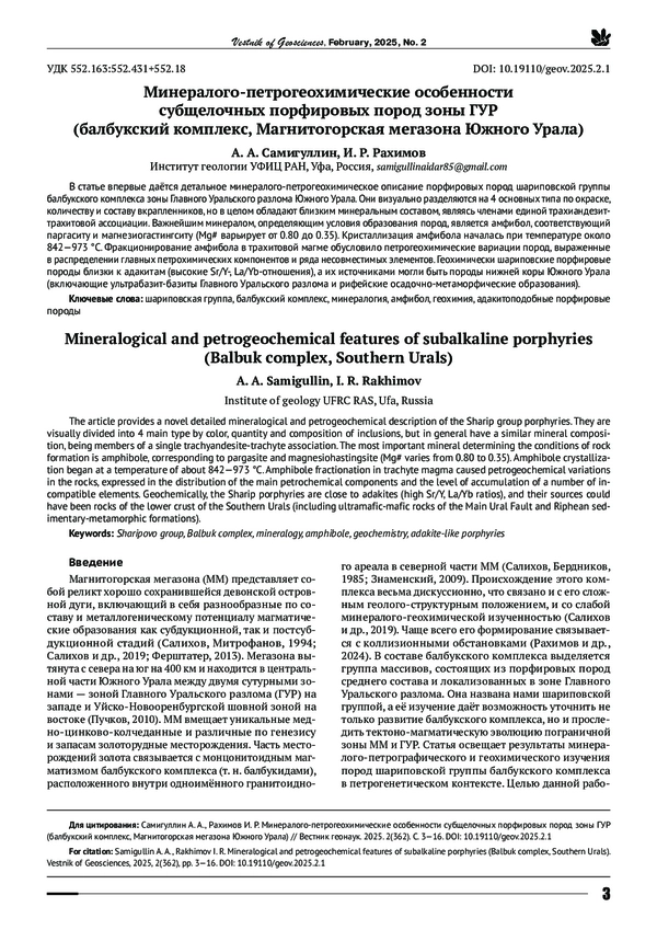 Статья: МИНЕРАЛОГО-ПЕТРОГЕОХИМИЧЕСКИЕ ОСОБЕННОСТИ СУБЩЕЛОЧНЫХ ПОРФИРОВЫХ ПОРОД ЗОНЫ ГУР (БАЛБУКСКИЙ КОМПЛЕКС, МАГНИТОГОРСКАЯ МЕГАЗОНА ЮЖНОГО УРАЛА)
