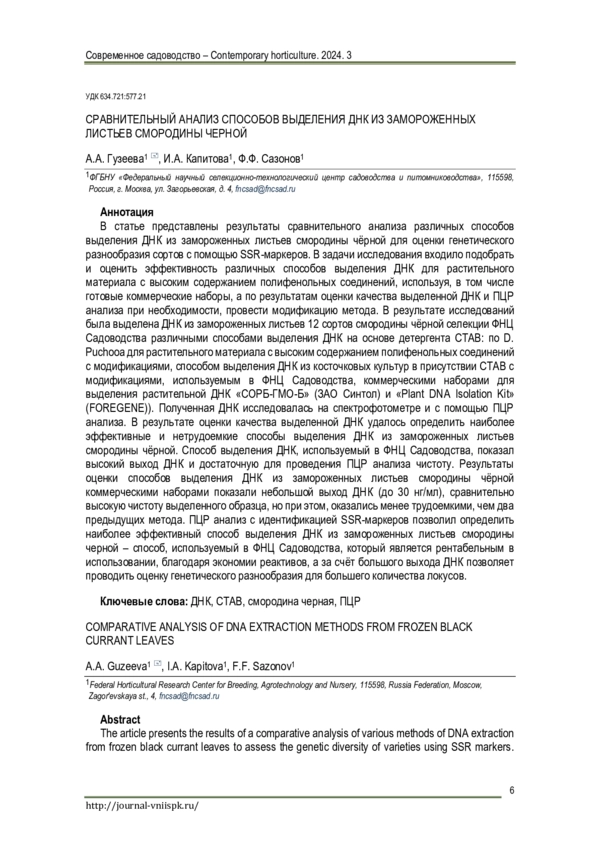 В статье представлены результаты сравнительного анализа различных способов выделения ДНК из замороженных листьев смородины чёрной для оценки генетического разнообразия сортов с помощью SSR-маркеров. В задачи исследования входило подобрать и оценить эффективность различных способов выделения ДНК для растительного материала с высоким содержанием полифенольных соединений, используя, в том числе готовые коммерческие наборы, а по результатам оценки качества выделенной ДНК и ПЦР анализа при необходимости, провести модификацию метода. В результате исследований была выделена ДНК из замороженных листьев 12 сортов смородины чёрной селекции ФНЦ Садоводства различными способами выделения ДНК на основе детергента CTAB: по D. Puchooa для растительного материала с высоким содержанием полифенольных соединений с модификациями, способом выделения ДНК из косточковых культур в присутствии СТАВ с модификациями, используемым в ФНЦ Садоводства, коммерческими наборами для выделения растительной ДНК «СОРБ-ГМО-Б» (ЗАО Синтол) и «Plant DNA Isolation Kit» (FOREGENE)). Полученная ДНК исследовалась на спектрофотометре и с помощью ПЦР анализа. В результате оценки качества выделенной ДНК удалось определить наиболее эффективные и нетрудоемкие способы выделения ДНК из замороженных листьев смородины чёрной. Способ выделения ДНК, используемый в ФНЦ Садоводства, показал высокий выход ДНК и достаточную для проведения ПЦР анализа чистоту. Результаты оценки способов выделения ДНК из замороженных листьев смородины чёрной коммерческими наборами показали небольшой выход ДНК (до 30 нг/мл), сравнительно высокую чистоту выделенного образца, но при этом, оказались менее трудоемкими, чем два предыдущих метода. ПЦР анализ с идентификацией SSR-маркеров позволил определить наиболее эффективный способ выделения ДНК из замороженных листьев смородины черной – способ, используемый в ФНЦ Садоводства, который является рентабельным в использовании, благодаря экономии реактивов, а за счёт большого выхода ДНК позволяет проводить оценку генетического разнообразия для большего количества локусов.