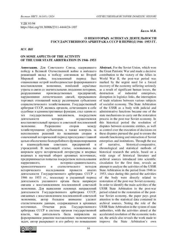 Для Советского Союза, одержавшего победу в Великой Отечественной войне и внёсшего решающий вклад в победу союзников во Второй Мировой войне, послевоенный период был ознаменован острой необходимостью форсированного восстановления экономики, понёсшей серьёзные утраты в связи со значительными людскими потерями, разрушениями производственных предприятий, нарушениями логистических связей, прерыванием торговых отношений между различными субъектами социалистического хозяйствования. Государственный арбитраж СССР, являясь органом, сочетающим в себе судебные и административные функции, стал одним из тех государственных механизмов, посредством деятельности которых осуществлялся восстановительный процесс в советской послевоенной экономике. Разрешение споров между хозяйствующими субъектами, а также контроль за исполнением решений по названным спорам в означенный исторический период преследовал главной целью обеспечение бесперебойного функционирования и взаимодействия советских предприятий и учреждений. В настоящей статье, основываясь на широком круге исторической литературы и впервые водимых в научный оборот архивных источниках, предпринимается попытка посредством использования нарративного, историко-сравнительного, хронологического и статистического методов исторического исследования провести анализ деятельности Государственного арбитража СССР с 1946 по 1953 гг., поскольку в указанный период деятельность указанного органа была напрямую связана с восстановлением послевоенной советской экономики. Для выявления основных направлений деятельности Государственного арбитража СССР, связанных с восстановлением послевоенной советской экономики, автор большое внимание уделяет статистическим данным, содержащимся в архивных источниках. Отмечая роль Государственного арбитража СССР в системе органов государственной власти, чья деятельность была направлена на форсированное решение поставленных экономических задач, автор раскрывает и его работу по повышению собственной эффективности. В статье характеризуется историческая ситуация, в которой Государственному арбитражу пришлось функционировать и развиваться после окончания Великой Отечественной войны.